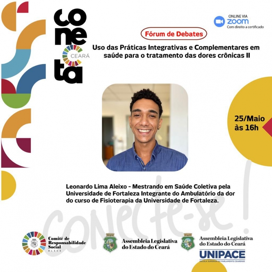 O primeiro fórum, que aconteceu dia 18, e o de amanhã, 25 de maio, às 16h, apresentam o tema “Uso das práticas integrativas e complementares em saúde para o tratamento das dores crônicas”, com Leonardo Lima Aleixo, mestrando em Saúde Coletiva pela Universidade de Fortaleza (Unifor) e integrante do Ambulatório da Dor do curso de Fisioterapia da mesma instituição.