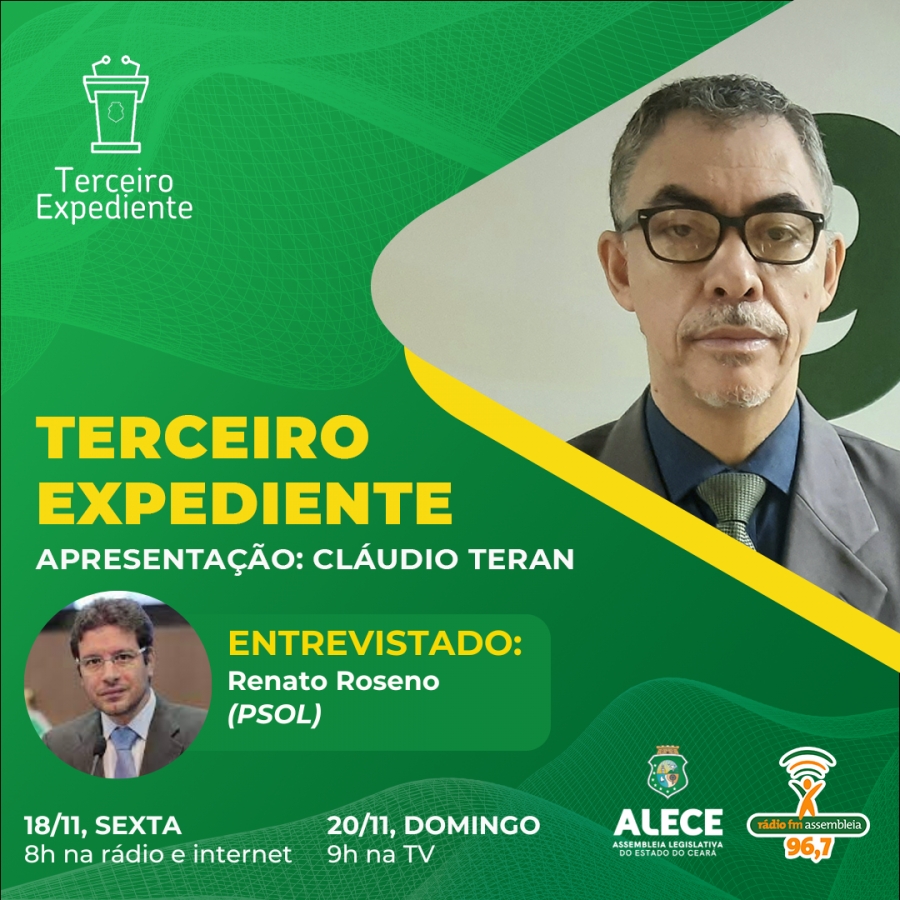 O programa Terceiro Expediente, da rádio FM Assembleia (96,7MHz), entrevista, nesta sexta-feira (18/11), a partir das 8h, o deputado Renato Roseno (Psol), que apresenta seu mandato na Alece e conta sua história de vida e trajetória política.