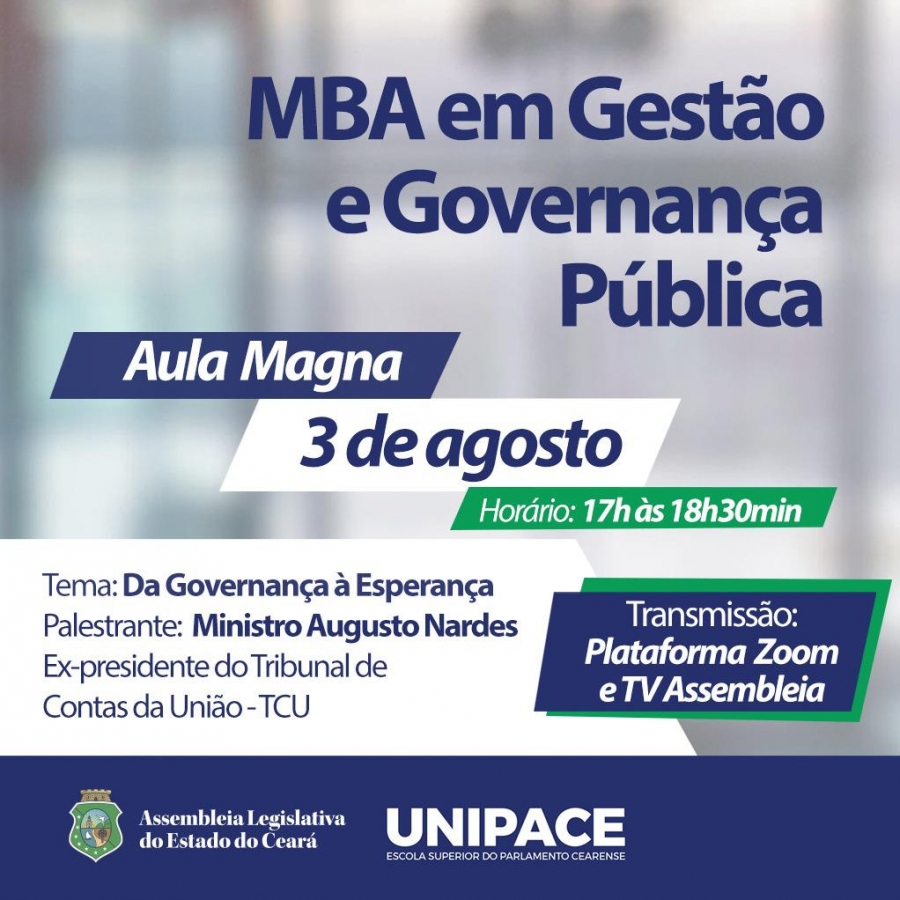 Já na próxima quinta-feira (05/08), às 19h, acontecerá a aula magna do MBA em Assessoria Parlamentar, também pela plataforma Zoom. A medida decorre da necessidade de cumprir todas as normas de segurança sanitária para evitar a disseminação do novo coronavírus. O convidado é o presidente da Assembleia Legislativa, deputado Evandro Leitão (PDT), com o tema “Poder Legislativo: Representatividade e Desenvolvimento Sustentável”.